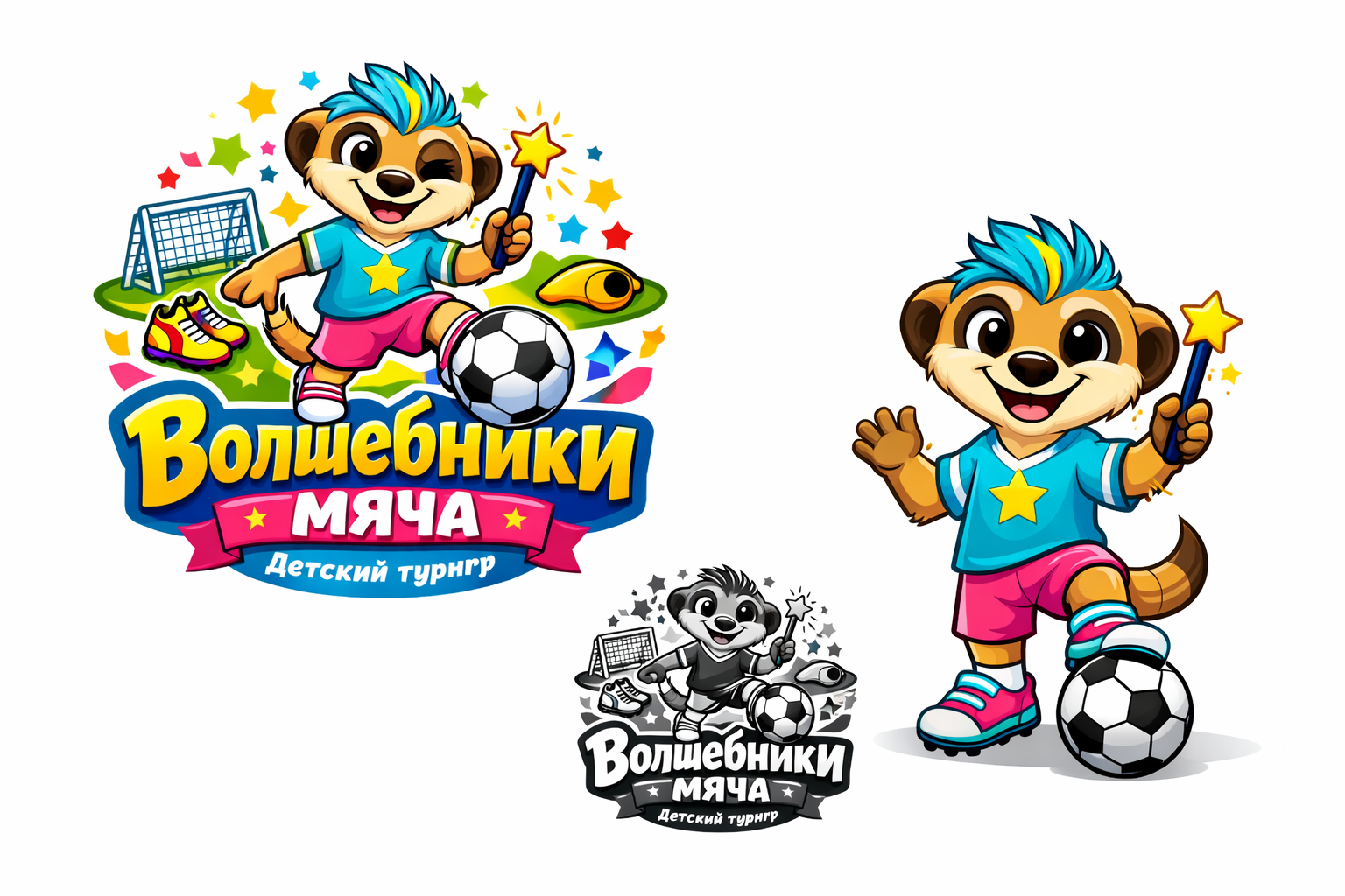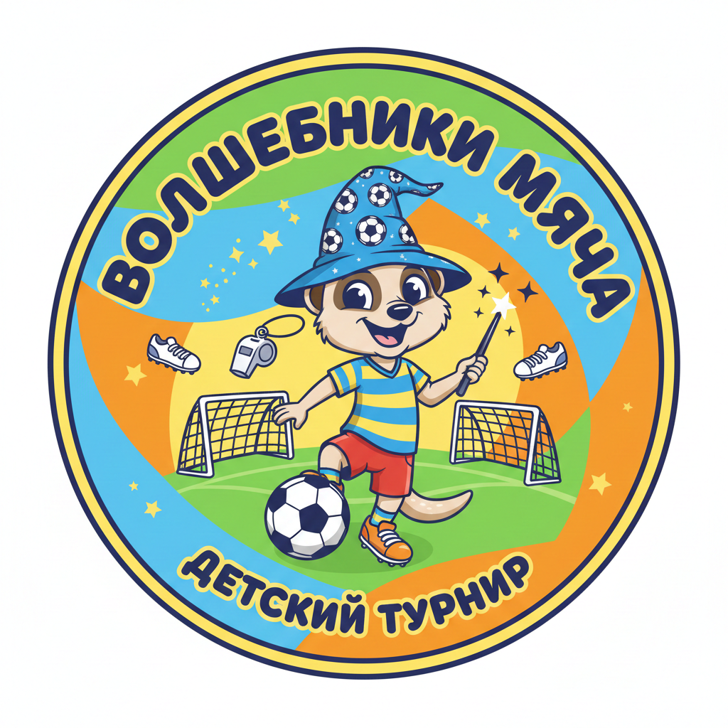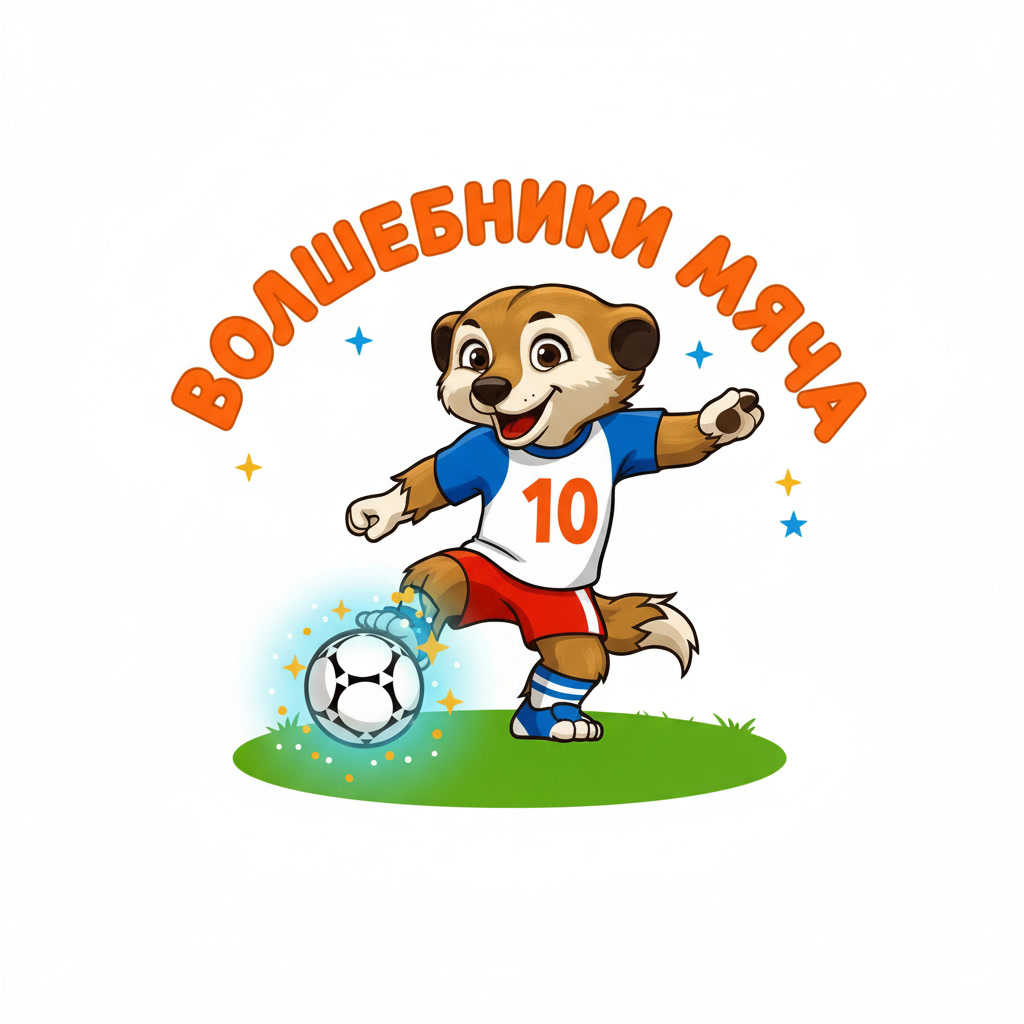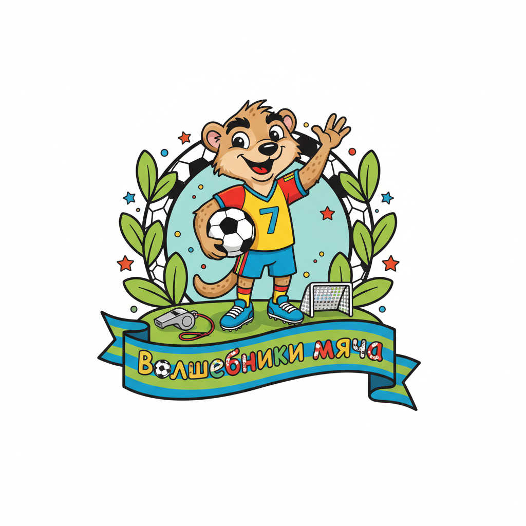 Техническое задание на разработку логотипа для детского мини-футбольного турнира "Волшебники мяча" 1. Основная концепция: - Разработать логотип для детского мини-футбольного турнира "Волшебники мяча". - Главным героем логотипа должен быть сурикат в мультяшном стиле. - Сурикат должен быть изображен в футбольной форме,с мячом - Логотип должен символизировать детский футбол, быть ярким, жизнерадостным и праздничным. 2. Элементы логотипа: - Сурикат в футбольной форме. - Футбольный мяч. - возможны элементы, символизирующие детский футбол (например, маленькие бутсы, свисток, футбольные ворота - Название турнира "Волшебники мяча". 3. Цветовая гамма: - Яркие, жизнерадостные цвета, соответствующие тематике детского футбола. - Логотип должен быть выполнен в цветном варианте. - Также необходимо предусмотреть однотонный вариант для теснения и гравировки на медалях. 4. Формат и использование: - Логотип должен быть адаптирован для использования на медалях, кубках, форме и других материалах, банерах, фотозонах, связанных с турниром. Сам мультяшный герой должен быть подготовлен для фотозоны в стоячем положении отдельно от логотипа - Логотип должен быть легко узнаваемым и хорошо читаемым на всех носителях. - Однотонный вариант должен быть четким и контрастным для качественной гравировки. 5. Дополнительные требования: - Логотип должен вызывать положительные эмоции и ассоциироваться с праздником и весельем. - Дизайн должен быть простым и понятным для детей. 6. Логотип должен быть уникальным и не нарушать авторских прав.