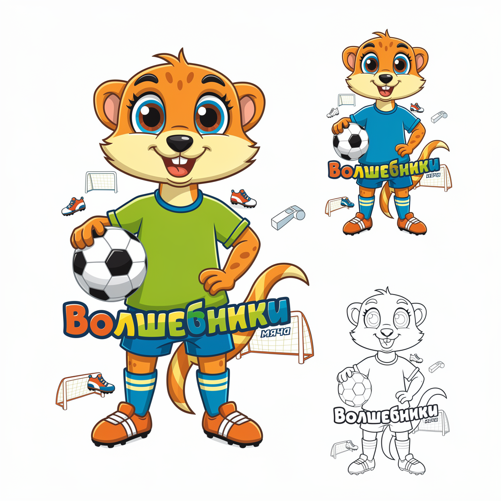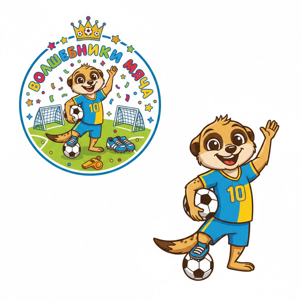 Техническое задание на разработку логотипа для детского мини-футбольного турнира "Волшебники мяча" 1. Основная концепция: - Разработать логотип для детского мини-футбольного турнира "Волшебники мяча". - Главным героем логотипа должен быть сурикат в мультяшном стиле. - Сурикат должен быть изображен в футбольной форме,с мячом - Логотип должен символизировать детский футбол, быть ярким, жизнерадостным и праздничным. 2. Элементы логотипа: - Сурикат в футбольной форме. - Футбольный мяч. - возможны элементы, символизирующие детский футбол (например, маленькие бутсы, свисток, футбольные ворота - Название турнира "Волшебники мяча". 3. Цветовая гамма: - Яркие, жизнерадостные цвета, соответствующие тематике детского футбола. - Логотип должен быть выполнен в цветном варианте. - Также необходимо предусмотреть однотонный вариант для теснения и гравировки на медалях. 4. Формат и использование: - Логотип должен быть адаптирован для использования на медалях, кубках, форме и других материалах, банерах, фотозонах, связанных с турниром. Сам мультяшный герой должен быть подготовлен для фотозоны в стоячем положении отдельно от логотипа - Логотип должен быть легко узнаваемым и хорошо читаемым на всех носителях. - Однотонный вариант должен быть четким и контрастным для качественной гравировки. 5. Дополнительные требования: - Логотип должен вызывать положительные эмоции и ассоциироваться с праздником и весельем. - Дизайн должен быть простым и понятным для детей. 6. Логотип должен быть уникальным и не нарушать авторских прав.