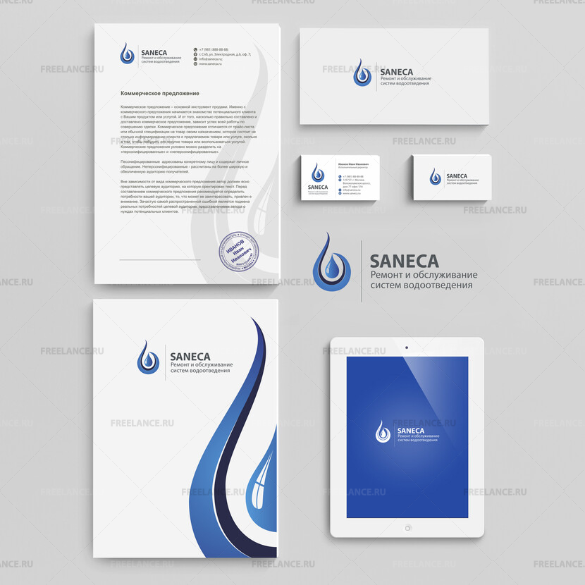 Разработка логотипа, фирменного знака и фирменного стиля для вновь созданного бренда "SANECA". Фирма в данный момент времени занимается ремонтом и обслуживанием систем водоотведения (канализации), монтажом станций глубокой биологической очистки сточных вод. В перспективе развитие направления по очистке промвентиляции.
