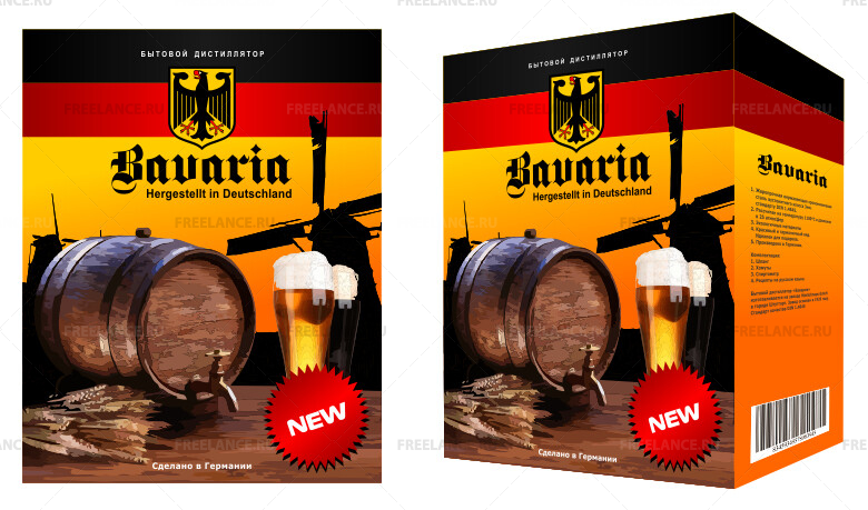 Разработать дизайн полноцветной картонной упаковки для бытового дестилятора изготовленного в Германии (в простонародье используемого в качетве самогонного аппарата)