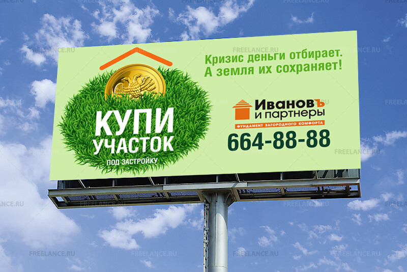 Смотря на биллборд потенциальный покупатель при наличии у него денег должен захотеть в условиях кризиса сохранить деньги не вложив их в покупку квартиры, или машины, а в землю для строительства там дачного участка или для последующей перепродажи.