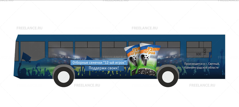 На выходе мы хотим получить изображения для использования его на 3х частях микроавтобусов (бока и задняя часть), а именно микроавтобусов Мерседес спринтер или подобных. Плюс изображение для оклейки целого большого городского автобуса (троллейбус, трамвай - еще не решили) с боковых сторон. Т.е. будет курсировать по городу один полностью обклеенный автобус плюс шесть микроавтобусов и троллейбус. Хочется получить креатив, который, безусловно, будет бросаться в глаза и запоминаться. Надо чтобы реклама привлекала жителей области для поиска семечек «12 игрок» среди других марок, находясь в магазинах города. У нас есть лозунг «здоровый образ - здоровое поколение». Нравятся фразы (они будут использоваться в радио рекламе, и на других носителях)- «Отборные семечки «12-ый игрок» - всегда в первом составе на всех полках Калининграда», «он в отличной форме – достойная поддержка для наших», «Он всегда с теми, кто бодр, весел и молод». Но если придумается что-то интересное, связанное с названием и будет сочетаться с вашей концепцией, стилем макета – будет преимуществом. Нужно обязательно включить упаковку семечек (в прикрепленном файле пачка в развернутом виде, надо ее, конечно, срезать по бокам)и именно она должна запоминаться и быть на почетном месте. Также указать, что семечки производятся в г. Светлый, Калининградской области.