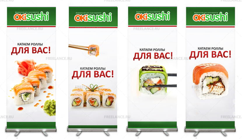 Okiisushi продает вкусные роллы в формате "возьми с собой". У нас можно покупать от одного "кусочка". Работаем в сегменте дискаунт. На сегодняшний момент открыто две точки. Необходимо доработать оформление точки. Цель: привлечение внимания потенциальных покупателей, бросив взгляд на нас они должны понять что мы продаем роллы, а картинка должна заставить "сработать" их пищевые рефлексы.
