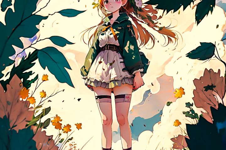 2D рыжая девочка стоит на пригорке и смотрить вдаль, на фоне облака, а по бокам растения и цветы
