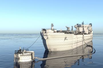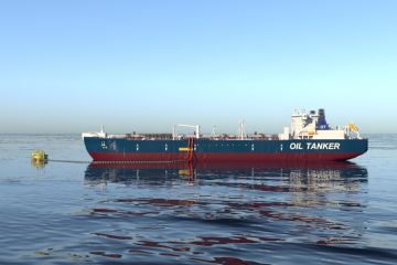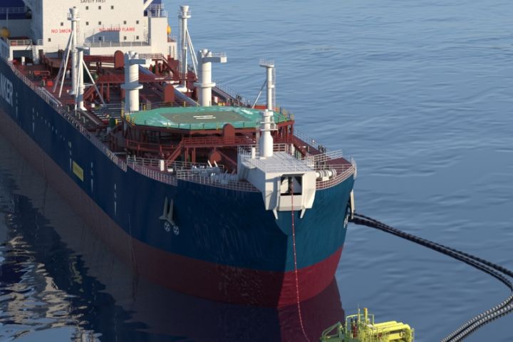 Нефтяной танкер у одноточечной системы швартовки (буй SPM). Нефтяной терминал с подсоединенными гибкими шлангами. Процесс перегрузки нефти.