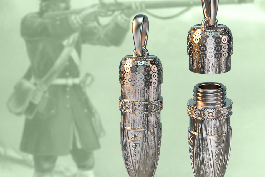 3д-модель подвески в виде пули. Пуля-контейнер состоит из 2-х частей. Длина 34 мм (без учета ушка) Диаметр 10,6 мм