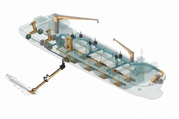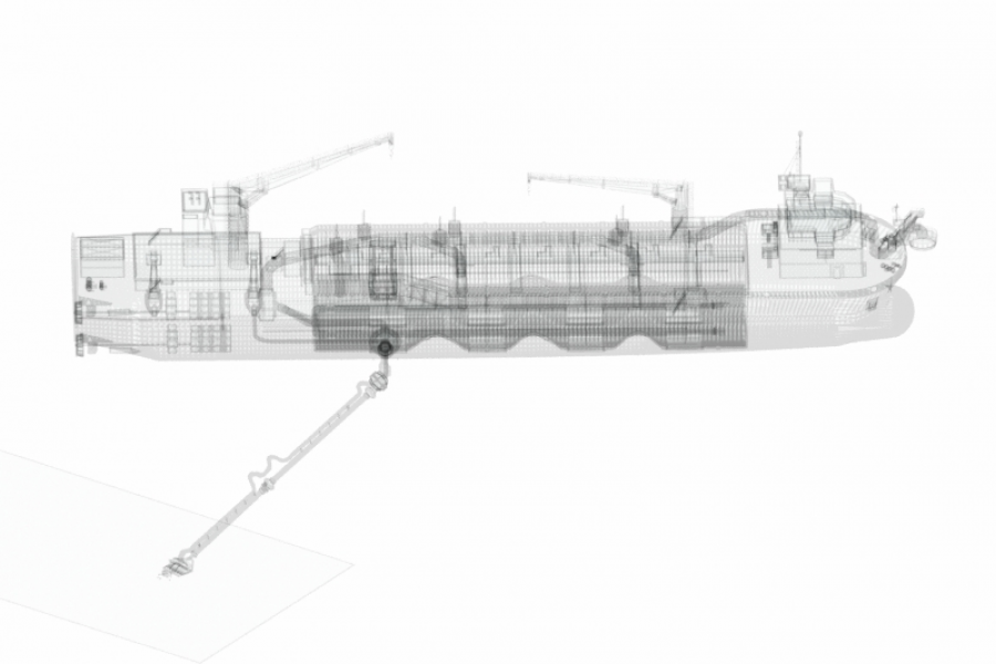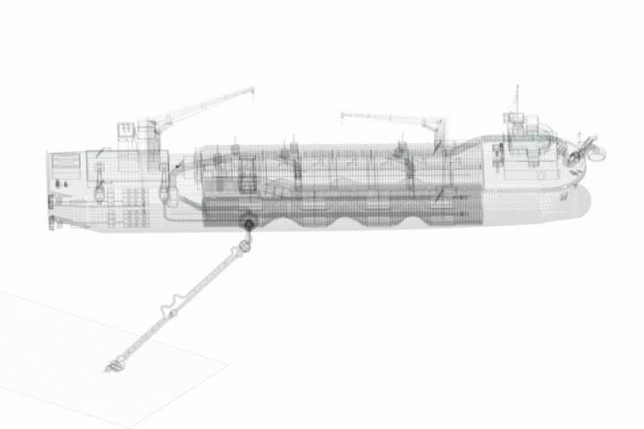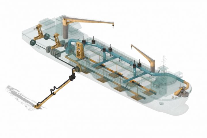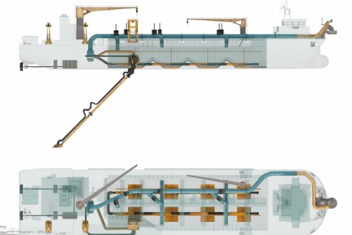 Судно технического флота, предназначенное для дноуглубительных работ и добычи нерудных строительных материалов. Бункерный земснаряд. Схема земснаряда с расположением внутренних и наружных труб и объектов. Схема позволяет рассмотреть способ забора грунта и перемещения грунта внутри судна.