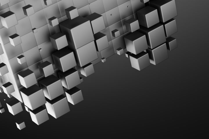 Цикличное вращение темных металлических кубов, абстракция. Разрешение 6144 х 3240. 6К. Для баров, салонов, клубов и тд.