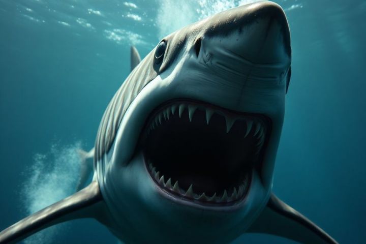 Фотореалистичное подводное изображение, полный рост, высокая детализация зубов и текстуры кожи, насыщенные цвета, драматическое освещение, передний план резко фокусируется на пасти, фон слегка размытый, ощущение движения и хищной мощи, кинематографическая атмосфера. Работа выполнена с использованием нейросети Stable Diffusion.