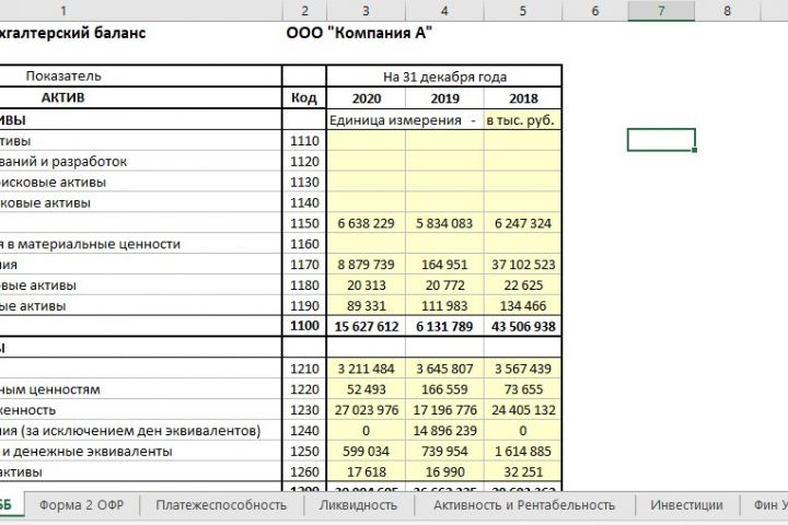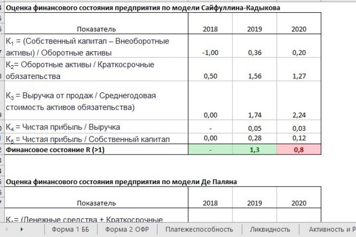 Бланк для анализа финансовых показателей контрагента на основе Бухгалтерского баланса и Отчета о прибылях и убытках. В таблицах есть расчет самих показателей и их пояснение. Рассчитываются показатели: