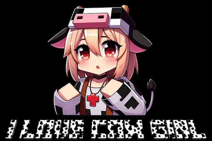 Сгенерировано нейросетью. На изображении представлена аниме девушка в стиле Minecraft, которая одета в костюм коровы. У неё короткие светлые волосы и большие выразительные красные глаза, излучающие невинность. На голове у неё шапка в виде коровьей головы с характерными ушами и рогами. Девушка выглядит мило и немного застенчиво, с поднятыми руками и открытым выражением лица. Внизу написано "I LOVE COW GIRL" стильным шрифтом, что подчеркивает её очарование и игривый характер. Фон яркий и контрастный, что делает персонажа еще более привлекательным. Можно использовать как принт. Фон прозрачный.