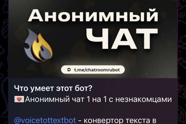 Здравствуйте продаю скрипт на анонимный чат боты для знакомств @Anonimka_znakomstva_bot 170$ @chatroomrubot 60$ У обеих есть покупка VIP, рассылки, рекламы, вывод средств на карту через сайт, разница только в дизайне и в модуле покупки VIP