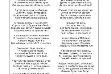 Продаю шуточное , юмористическое стихотворение (балладу), героем которого является офисная работница, мама, деловая женщина, постоянно голодная и забывающая взять обед на работу. Ее коллега заботится о ней и предлагает угощение - батончик НАТСа. После этого у героини начинаются приключения, она активна и бодра.