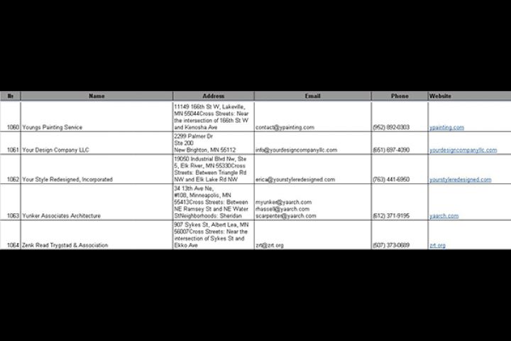 База компаний занимающихся архитектурой и дизайном интерьера. 1064 строчки. США. Формат данных: Google Spreadsheet, Microsoft Excel, PDF. Name | Address | Email | Phone | Website