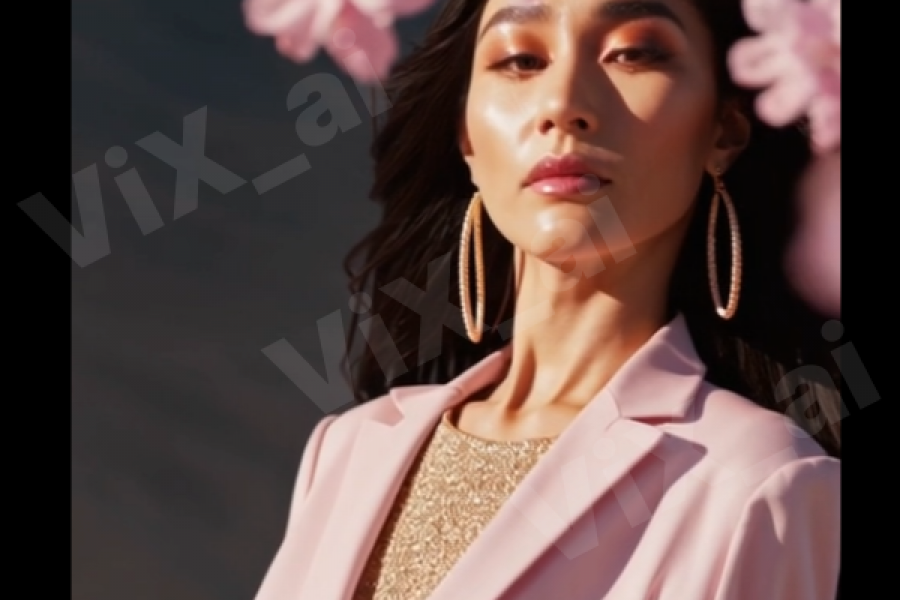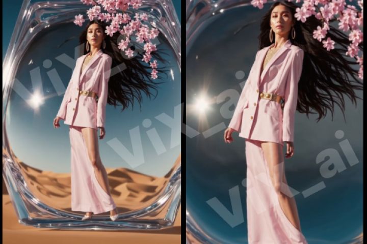 В центре композиции — эффектная модель в розовом костюме, стоящая внутри стеклянной инсталляции, на фоне пустыни и под цветущими ветвями сакуры. Камера плавно движется, создавая ощущение легкости и магии. Видео выполнено в вертикальном формате 9:16 — готово к размещению в сторис или reels (или можно обрезать в формат 1:1 для ленты).