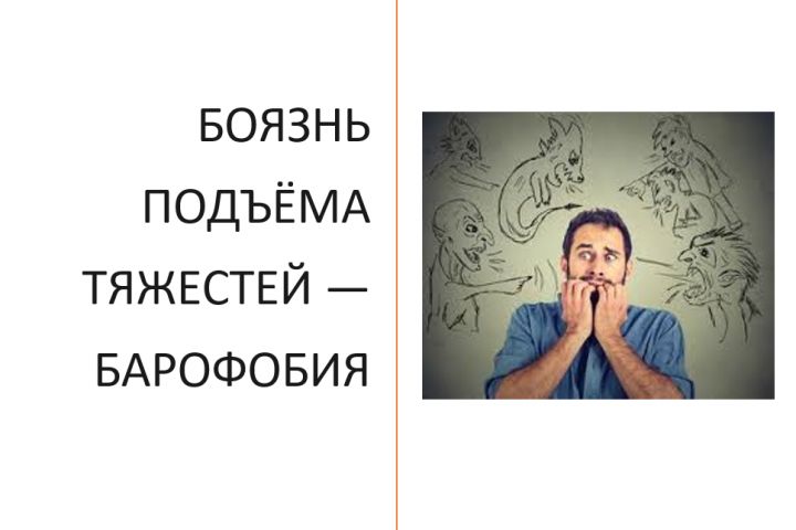 Барофобия, также известная как боязнь подъёма тяжести, представляет собой вид фобии, при которой человек испытывает крайние формы патологической обеспокоенности и даже ужаса перед поднятием тяжёлых предметов. Проявления характеризуются симптомокомплексом патофизиологической и психоэмоциональной направленности. Этиология фобийности может быть связана с разными факторами, включая негативный опыт, травмы, психологические проблемы, генетической предрасположенностью.
