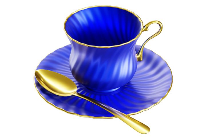 Иллюстрация синей чашки с блюдцем и ложкой на прозрачном фоне (png, 4Mb)