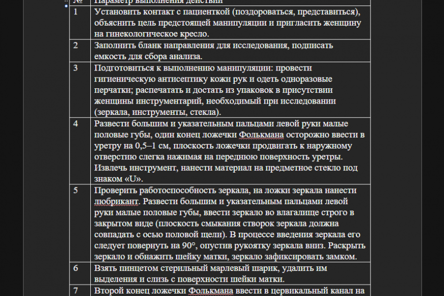 Продаю чек-лист "Взятие мазков для бактериоскопического исследования из влагалища". Указан перечень действий, показания к процедуре, оснащение, а также сроки выдачи результатов.