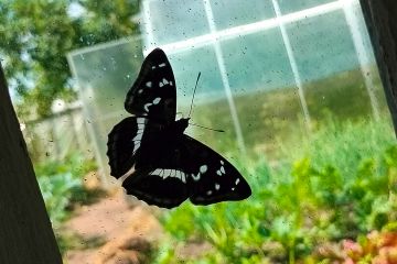 Черно-белая бабочка Пестрокрыльница (Araschnia levana) сидит на окне на фоне огорода