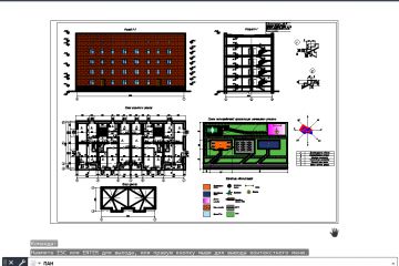 Работа по 4-этажному, двухсекционному жилому дому, состоящая из плана этажа, фасада, разреза, плана кровли, ген. плана, розы ветров, узлов, спецификаций окон, дверей и пола.