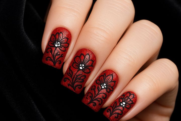 Формат JPEG с высоким разрешением, подчёркивающий контраст между сияющими ногтями и мягкой текстурой бархата. Фон придаёт работе глубину и роскошный вид, идеально подходящий для промо-материалов, сайтов салонов красоты и социальных сетей.