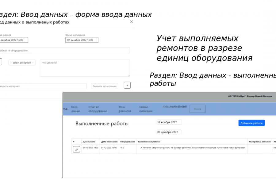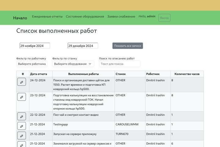 Приложение изначально создавалось для ремонтной службы карьера. С тем, чтобы улучшить текущий процесс, когда работы записывались в таблицу эксель, планируемые работы по сути не учитывались, заявки делались устно и имели свойство забываться. Смысл приложения в том, чтобы было удобно учитывать все работы по ремонту и обслуживанию оборудованию, а также организовать систему хранения информации.