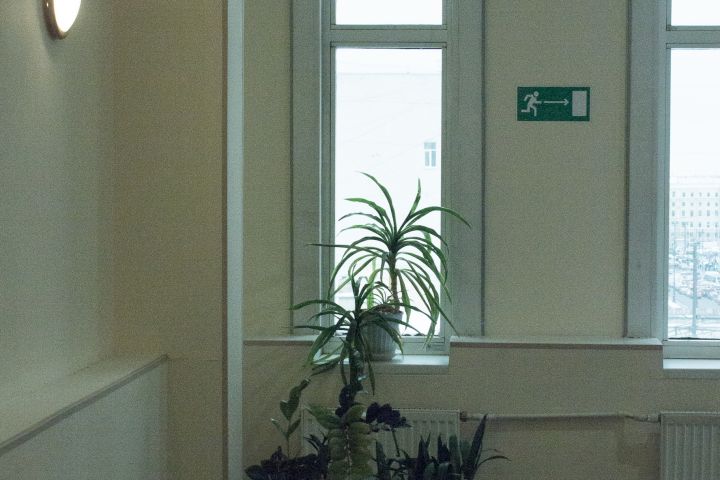 Цветы в коридоре в офисном центре рядом с окном