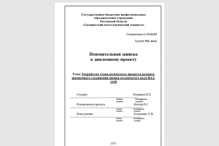 Тема дипломного проекта: "Разработка технологического процесса ремонта шпоночного соединения шкива коленчатого вала ВАЗ-2108" Диплом с чертежом сдавал на 5. За чертеж для данного диплом еще 2000.