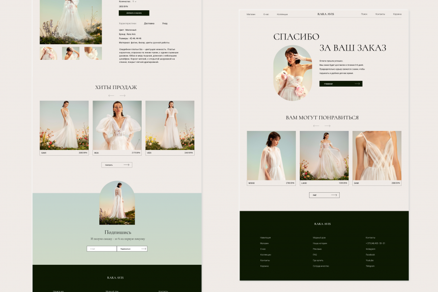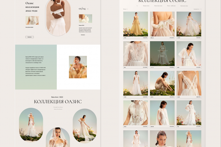Интернет-магазин свадебных платьев, макеты десктопной версии, готовы к вёрстке. Входит: главная страница, каталог, карточка товара, корзина, благодарность за заказ.