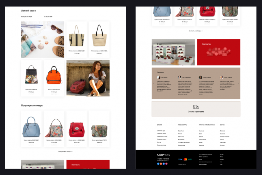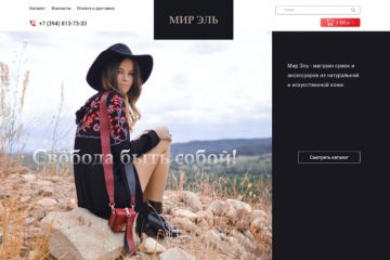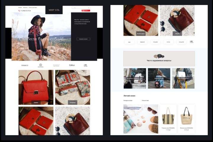 Готовый дизайн главной страницы интернет-магазина сумок и аксессуаров. Главная страница состоит из 8 блоков. Дизайн расчитан на ЦА от 35-55 лет, женщины из деловой сферы, среднего и премиум достатка.