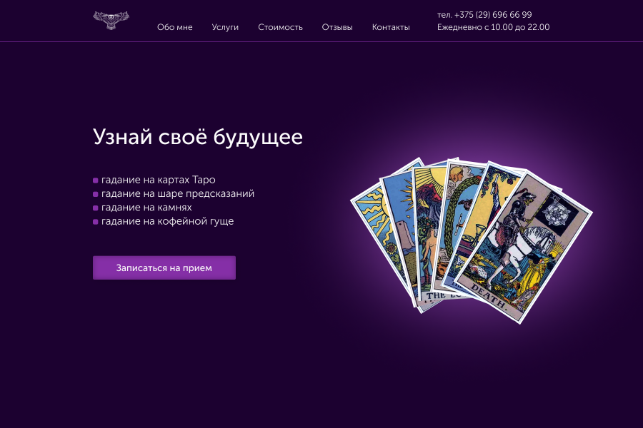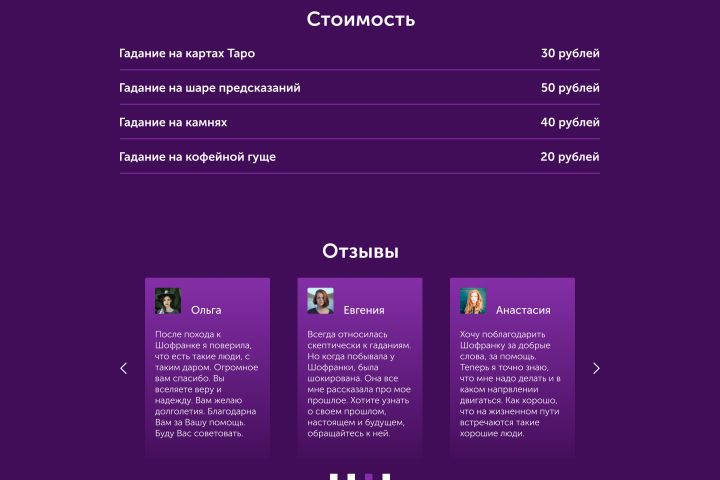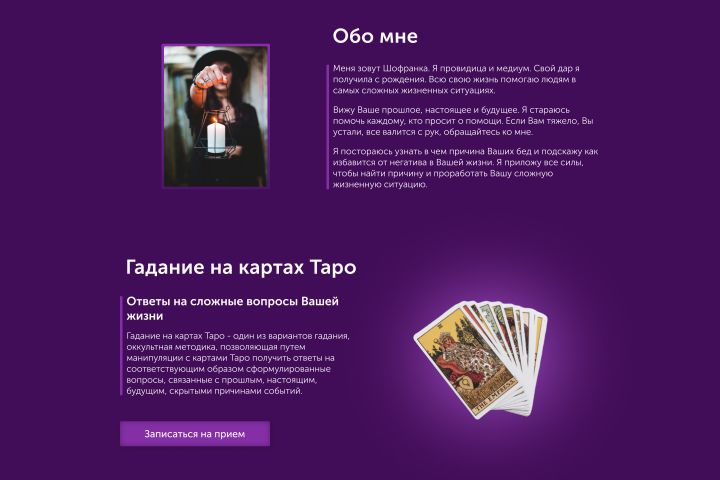 Имеется готовый дизайн Landing Page для ясновидящей на русском языке. Есть возможность доработать его именно под Вас за дополнительную стоимость (в процессе доработки может меняться).