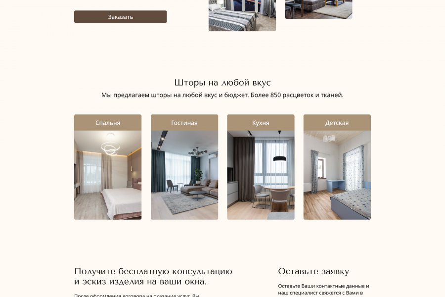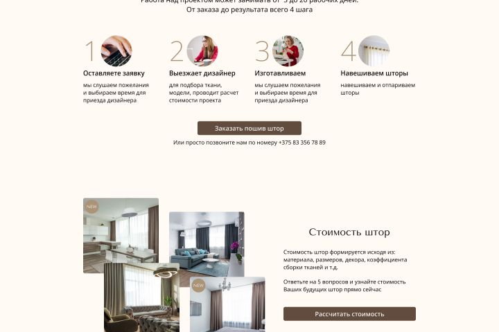 Имеется готовый дизайн Landing Page для салона штор. Есть возможность доработать его именно под Вас за дополнительную стоимость (в процессе доработки может меняться).
