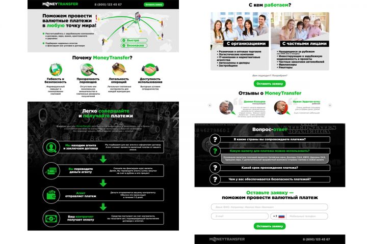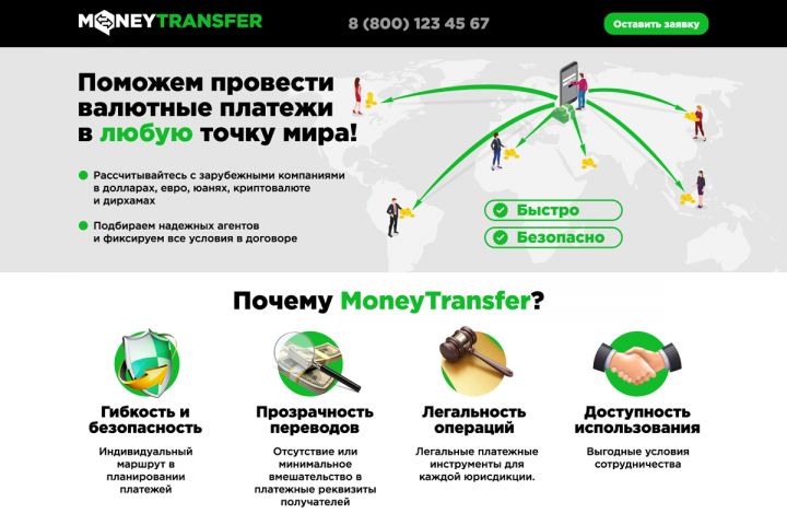 Дизайн лендинга Системы Денежных переводов. Название, логотип и дизайн - уникальные. Можно использовать "как есть". Возможна доработка под ваш контент.