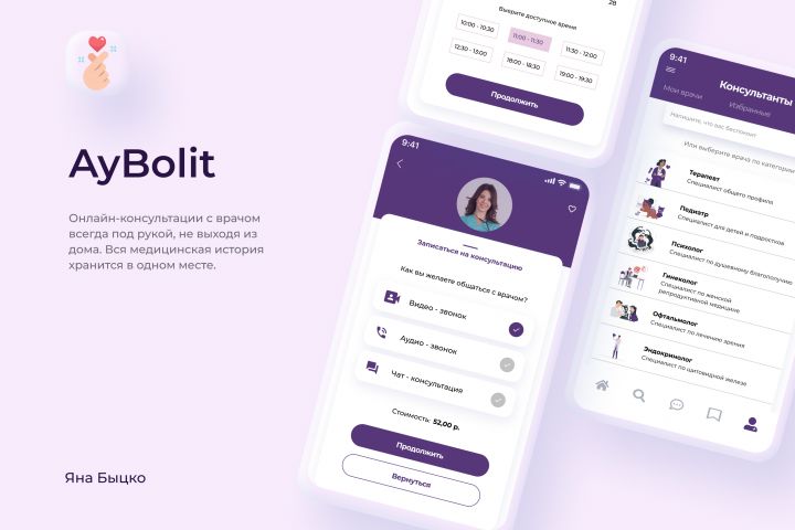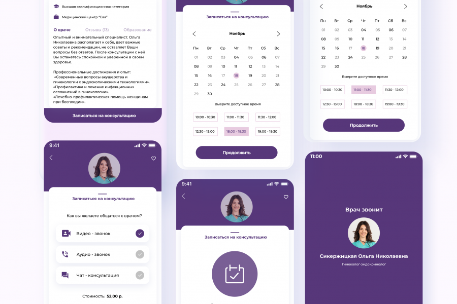 Мобильное приложение для онлайн-консультаций с врачом, хранение всей медицинской истории в одном месте. Входит: главная +13 страниц.
