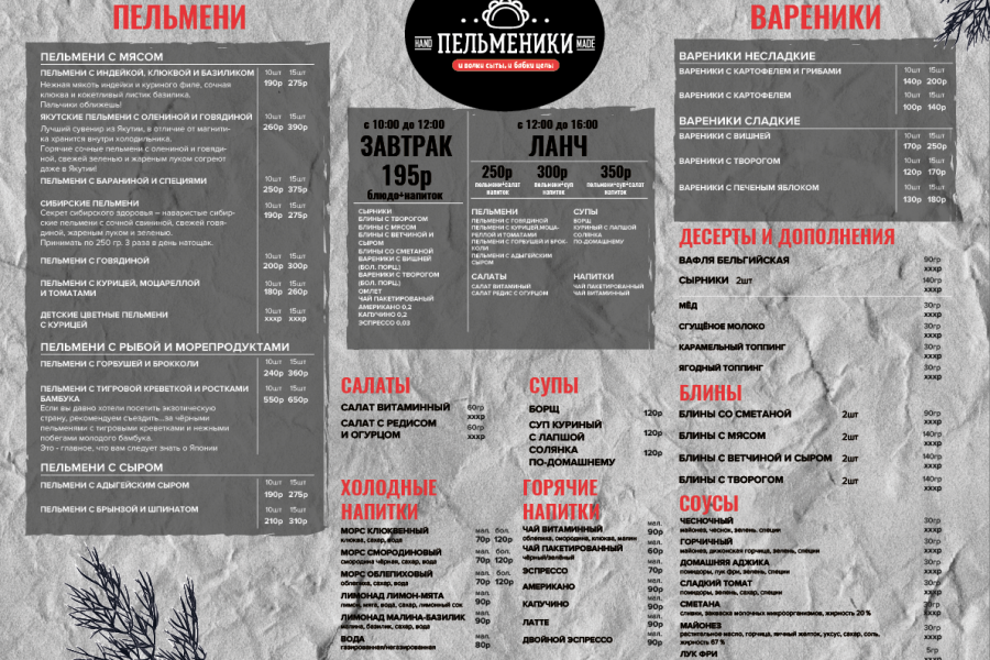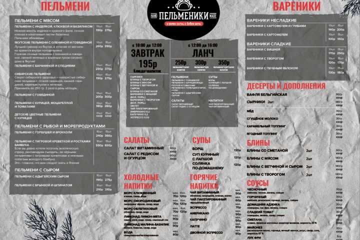 Дизайн меню для пельменной - 2 варианта В комплекте: 1. Дизайн 1 из 2-х на выбор 2. Шрифты(опционально) 3. Доработка и препресс (опционально)