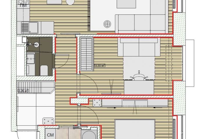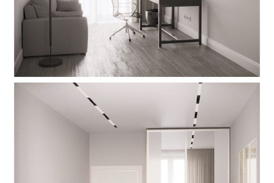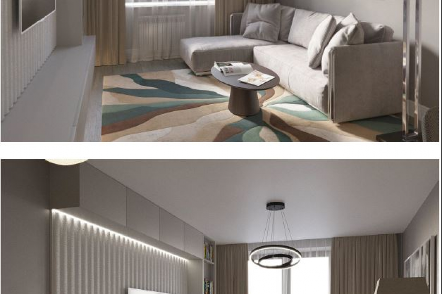 Дизайн-проект перепланировки квартиры свободной планировки 65 м2 в 2-х комнатную квартиру с санузлом, кухней и отдельными комнатами. Проект полностью готовый.
