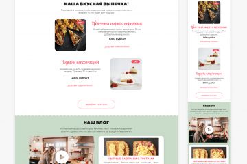 Дизайн сайта для кондитерской или кондитера. Также возможна адаптация для пекарни, кафе с десертами, кулинарной студии, кондитерской школы.