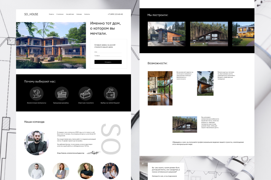 ✓ Блоки: Заявка, Команда, Мы построили, Преимущества, Возможности