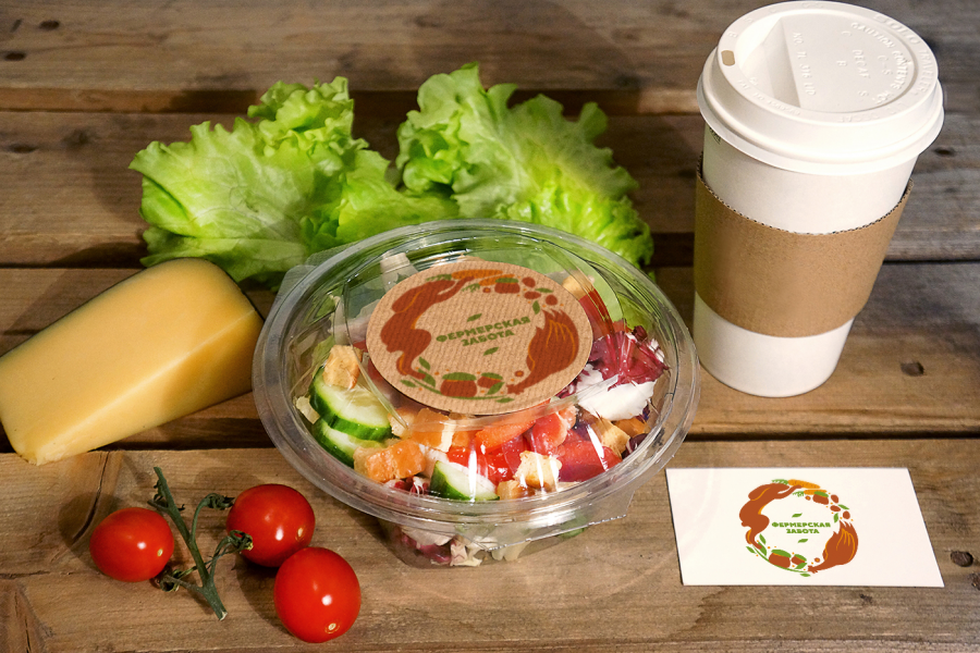 Эмблема «Фермерская забота» выполнена в виде стилизованного венка, образованного силуэтом курицы, кролика. Дополнительная графика - стилизация изображений фермерских продуктов (яйца, медовые бочонки, овощи) + дополнение зелёные листья, цветы. Цветовая гамма — тёплые терракотовые и зелёные оттенки, подчёркивающие натуральность и связь с природой. В центре венка размещена надпись «Фермерская забота», акцентирующая внимание на ценности заботы и фермерском происхождении продукции. Дизайн лаконичен и выразителен — идеально подходит для бренда, связанного с сельским хозяйством или фермерскими товарами.