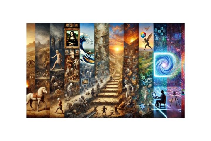 От наскальной живописи до цифрового NFT. Изображение, показывающее развитие искусства от древности до современного цифрового мира.