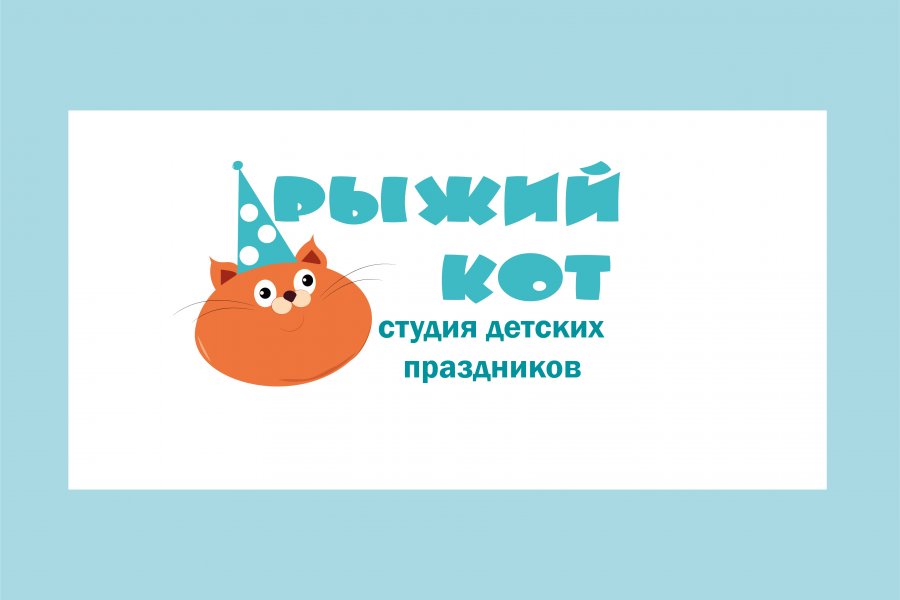 Студия детских праздников "Рыжий кот". Персонаж рыжий кот будет радовать вас на логотипе, афишах и визитке. Яркие цвета, шары, облака отлично вписываются в детскую тематику.