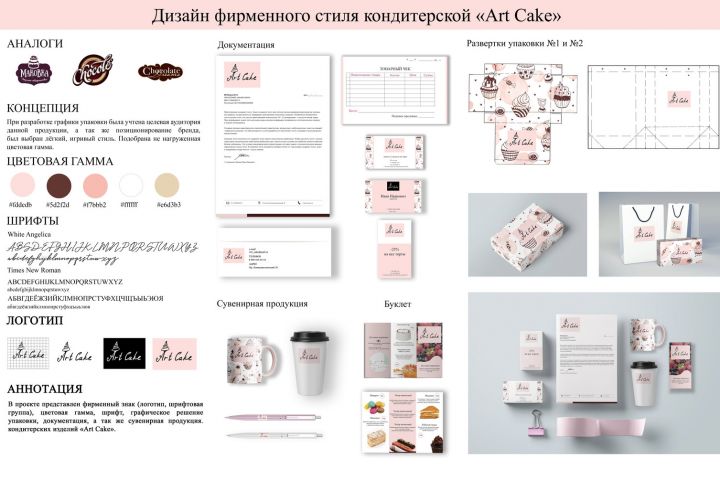 В данном проекте представлен фирменный стиль кондитерской , упаковки, сувенирная продукция, а также документация . Выполнен в приятной розовой гамме.