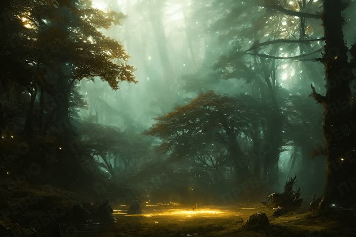 Фотореалистичный пейзаж фантастического леса в эпическом стиле. Концепт-арт, иллюстрация.