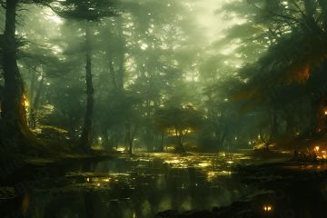 Фотореалистичный пейзаж, картина, иллюстрация, фантастический лес, эпик, концепт-арт, фантастика, фотореализм, диджитал арт, арт, эпический стиль, тёмный лес.
