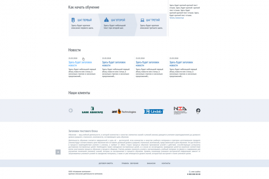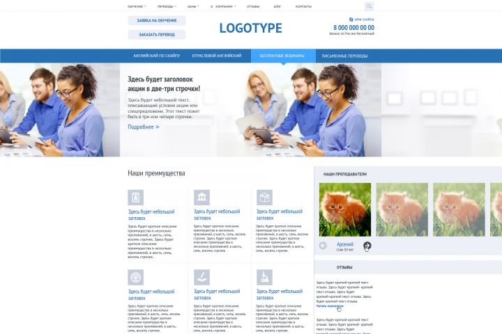 Главная страница со слайдером для продажи услуг в сфере образования. Возможна адаптация под другую сферу деятельности. Иконки и фото представлены в качестве примера и не входят в лот. Без верстки. Только psd - шаблон.