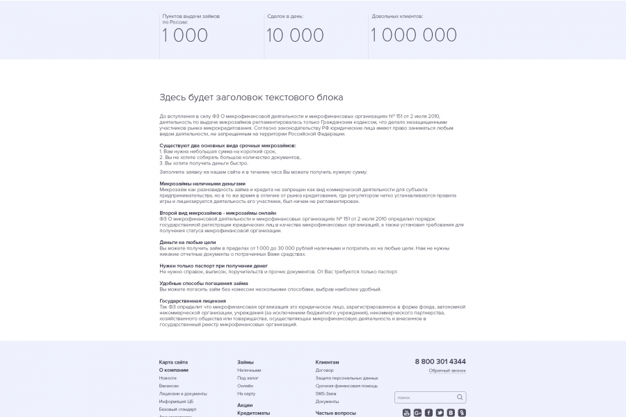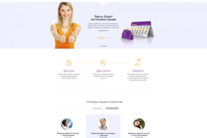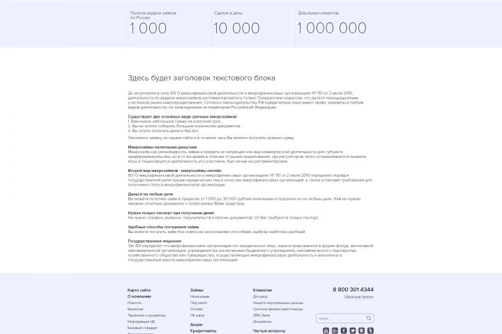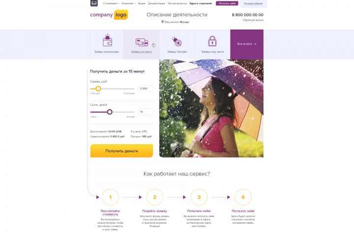 Главная страница сайта с калькулятором для финансовой организации, связаной с предоставлением кредитов и займов. Возможна адаптация под другую сферу деятельности.