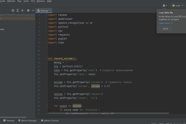 Продаю исходный код и программу голосового помощника на Python. Выполняет простейшие команды, показывает погоду в данный момент, время, может включать музыку. Очень подойдет для исследовательских, курсовых и проектов в школе, техникуме и университете, могу немного доработать программу. Можем договориться по цене