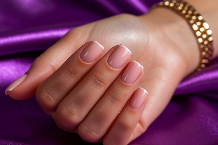 Цифровое изображение женской руки с аккуратными ухоженными ногтями на фоне фиолетовой атласной ткани.