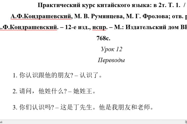 Готовые переводы (не гугл.переводчик). / Практический курс. 12-е изд. / А.Ф, Кондрашевский / Переводы после урока №12 (15 предложений) / Транскрипция (пиньинь) в наличии...