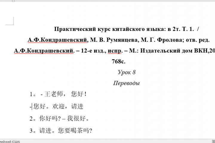 Китайский язык, А.Ф. Кондрашевский. Готовые переводы. Урок №8.